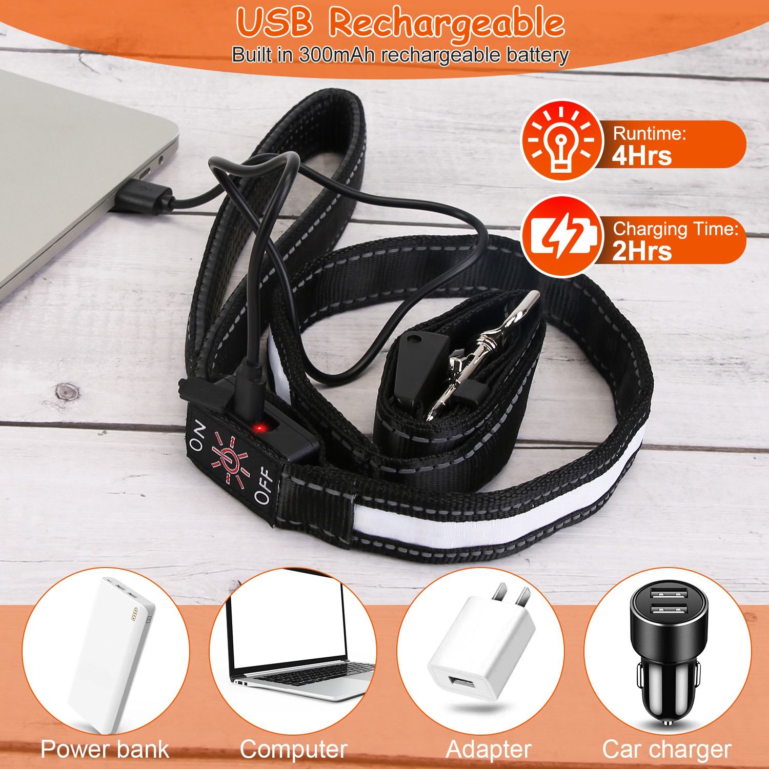 *USB Rechargeable & Long-lasting*:Built in 300mAh rechargeable battery,the dog leash with light can keep standby for 4 hours after 2 hours’ fast charging.