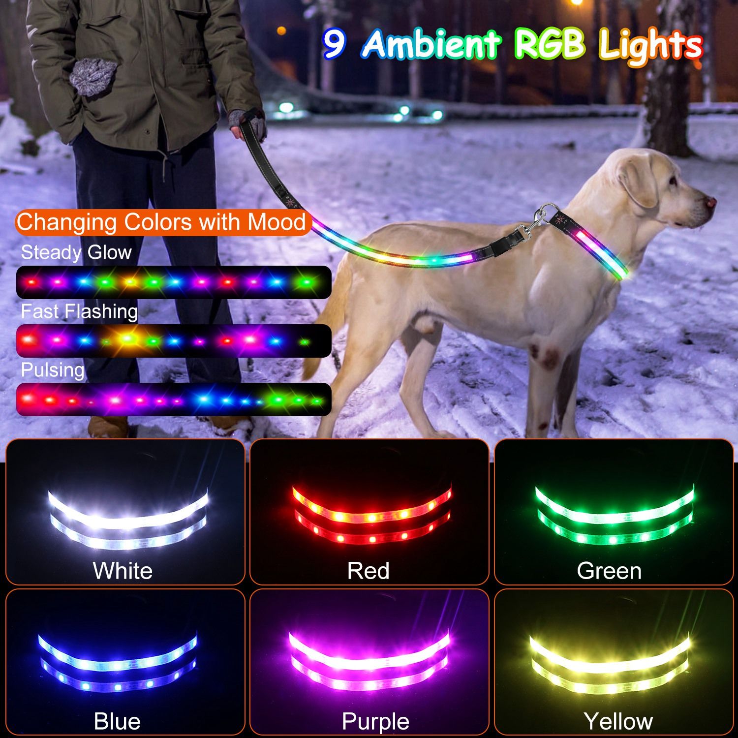 *9 Light Colors*:Built in 11 highly visible LED beads,our light up dog leash clears vision at night,helping both your dog and you notice potential dangers in the dark. The night glowing dog collar looks cool and shines brighter in the crowd,which create a sense of social atmosphere with 6 single colors and 3 lighting modes(Steady Glow/Fast Flashing/ Pulsing).