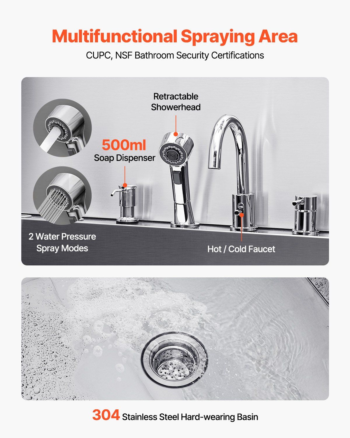 · More Comfortable Grooming: The dog grooming tub is featuring CUPC and NSF bathroom security certification, the hot and cold dual-control faucets and gentle/strong dual water pressure showerhead provide versatility. The 500 ml large-capacity soap dispenser ensures long-lasting use with each refill. The 304 stainless steel tub body is scratching-resistant and corrosion-proof