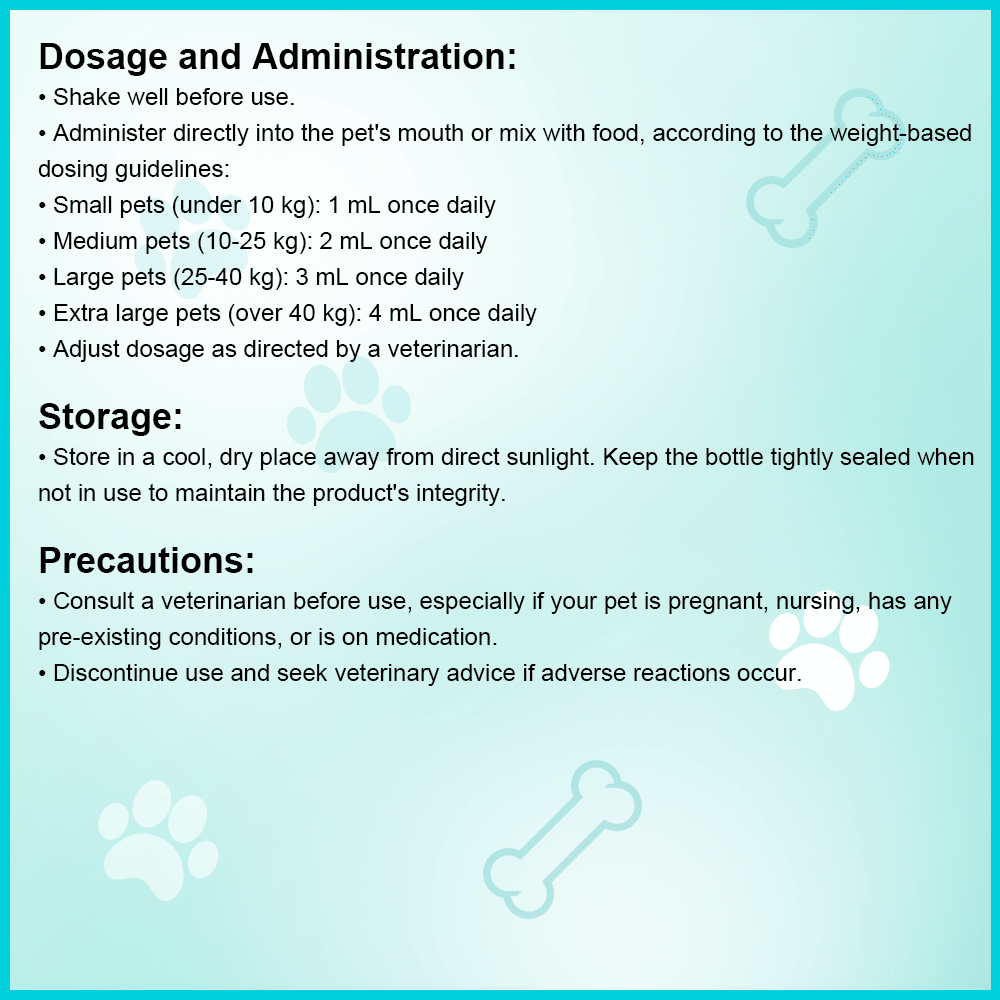 Our formula features a unique blend of carefully selected ingredients that work together to promote joint flexibility, reduce inflammation, and support overall mobility. Whether your pet is aging or simply needs an extra boost after an active day, this liquid supplement is easy to administer and highly effective.