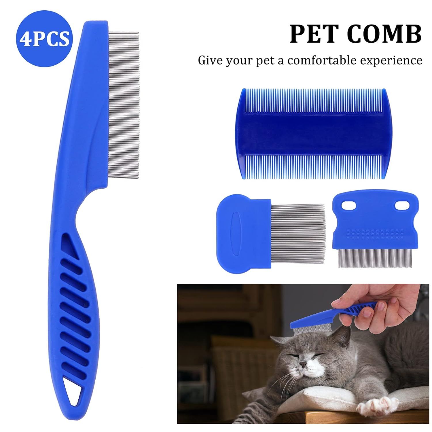 Package Include: You will get total 4 different kinds of flea combs, suitable for different kinds of pets, such as dogs, cats, rabbits, etc most of the house pets. Package List: 1Pcs stainless steel high strength teeth comb 5.5 x 1.18 in, 1Pcs double sides teeth lice comb 3.4 x 2 in, 1Pcs long stainless steel teeth comb 3.1 x 2 in, 1Pcs short stainless steel teeth tear stain remover comb 2.7 * 2.4 in.
