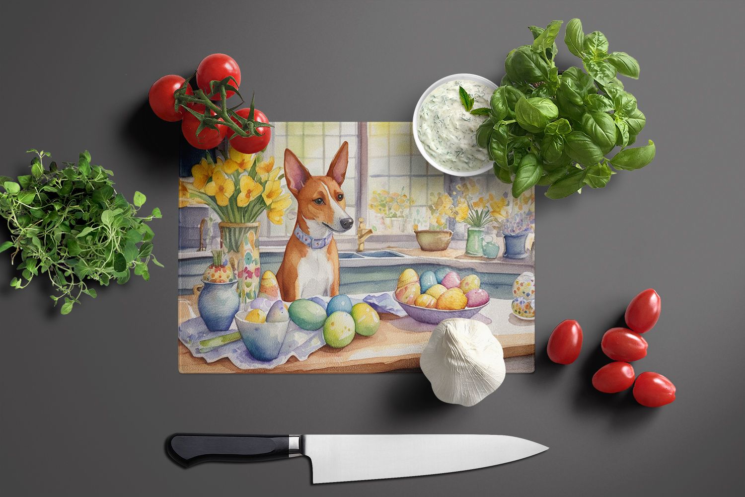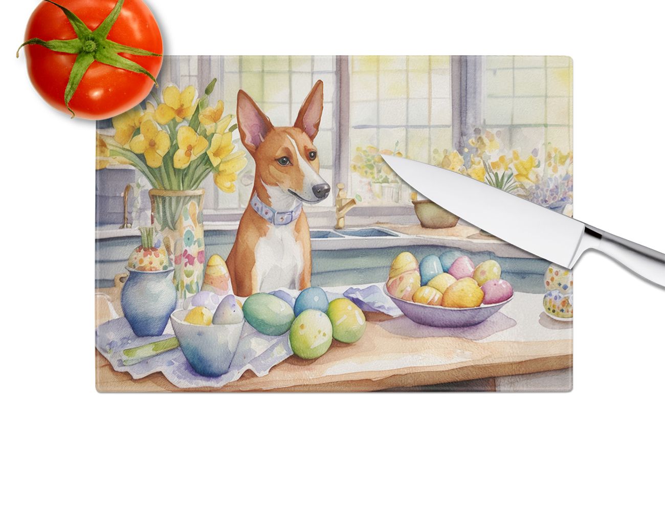 Glass Cutting Board featuring breed specific Basenji artwork. Celebrate Easter with this Easter Cutting Board. Introduce your kitchen to the vibrant, large Decorative Glass Cutting Board from Caroline's Treasures. Crafted from resilient tempered glass, this board is not only a utilitarian necessity but also a colorful art piece. With its generous dimensions of 15 inches in height and 12 inches in length, it offers ample space for all your cutting needs. Every piece showcases captivating artwork from distinguished artists, bringing an aesthetic edge to your kitchen. Beyond its attractive design, this cutting board ensures your countertop stays pristine and unscathed, owing to its heat-resistant properties. Engineered with user convenience in mind, it features non-skid feet for stability, and rounded corners for additional safety. Its robust construction renders it virtually unbreakable, guaranteeing longevity. The board comes with protective feet bumpers, maintaining its position during use. This product is recommended to be hand washed only. Proudly printed and assembled in the United States, this cutting board exemplifies superior craftsmanship. With Caroline's Treasures' Decorative Glass Cutting Board, you're investing in a blend of functionality and artistic flair.