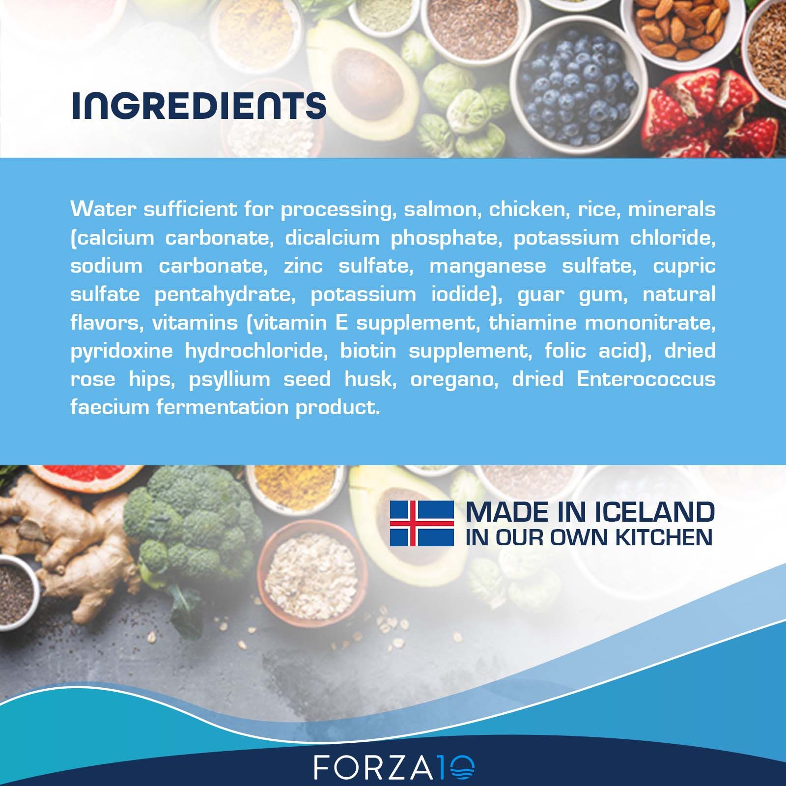 Water sufficient for processing, salmon, chicken liver, rice, minerals (dicalcium phosphate, calcium carbonate, salt, zinc sulfate, manganese sulfate, potassium iodine), cassia gum, guar gum, locust bean gum, xanthan gum, vitamins (vitamin D3 supplement, vitamin E supplement, thiamine mononitrate, pyridoxine hydrochloride, biotin, folic acid), taurine, vegetable oil, dried rose hips, psyllium seed husk, oregano, cultured lactic acid bacteria.