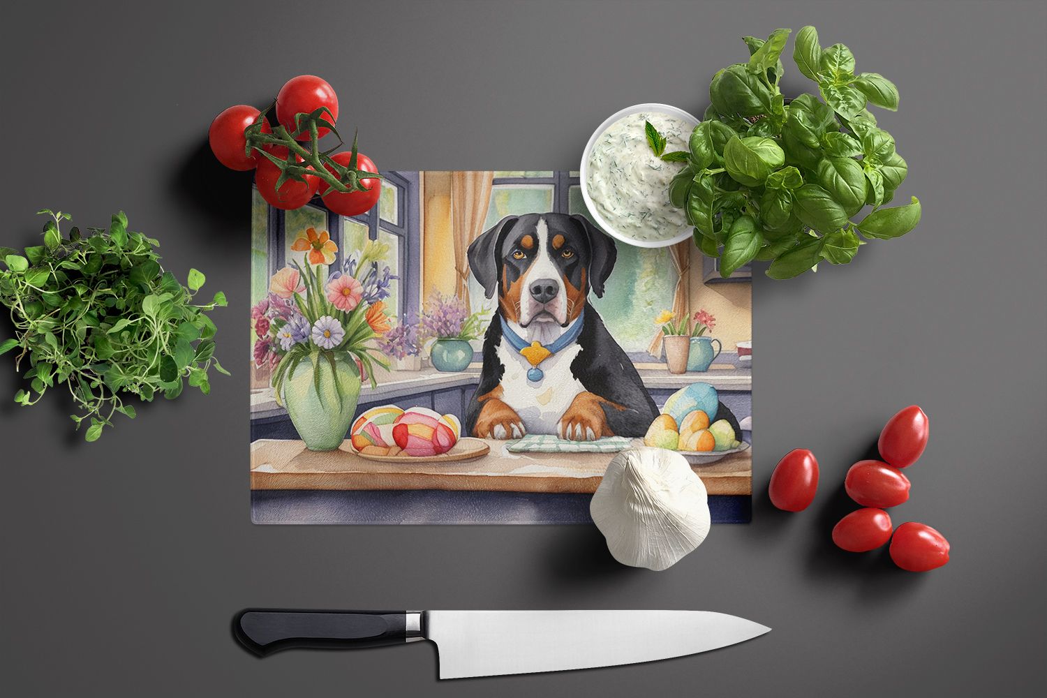 Glass Cutting Board featuring breed specific Greater Swiss Mountain Dog artwork. Celebrate Easter with this Easter Cutting Board. Introduce your kitchen to the vibrant, large Decorative Glass Cutting Board from Caroline's Treasures. Crafted from resilient tempered glass, this board is not only a utilitarian necessity but also a colorful art piece. With its generous dimensions of 15 inches in height and 12 inches in length, it offers ample space for all your cutting needs. Every piece showcases captivating artwork from distinguished artists, bringing an aesthetic edge to your kitchen. Beyond its attractive design, this cutting board ensures your countertop stays pristine and unscathed, owing to its heat-resistant properties. Engineered with user convenience in mind, it features non-skid feet for stability, and rounded corners for additional safety. Its robust construction renders it virtually unbreakable, guaranteeing longevity. The board comes with protective feet bumpers, maintaining its position during use. This product is recommended to be hand washed only. Proudly printed and assembled in the United States, this cutting board exemplifies superior craftsmanship. With Caroline's Treasures' Decorative Glass Cutting Board, you're investing in a blend of functionality and artistic flair.