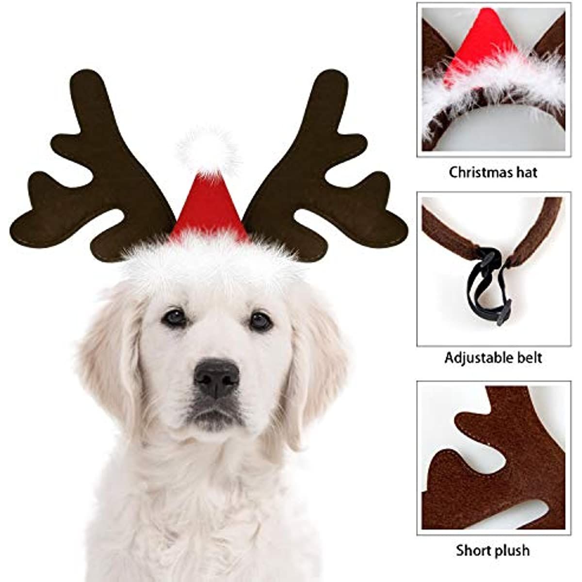 Cute Design: Classic christmas deer hat; with red santa hat and white pompom ball decor design; Let your pet be full of Christmas atmosphere; Elastic band easy on and easy off.