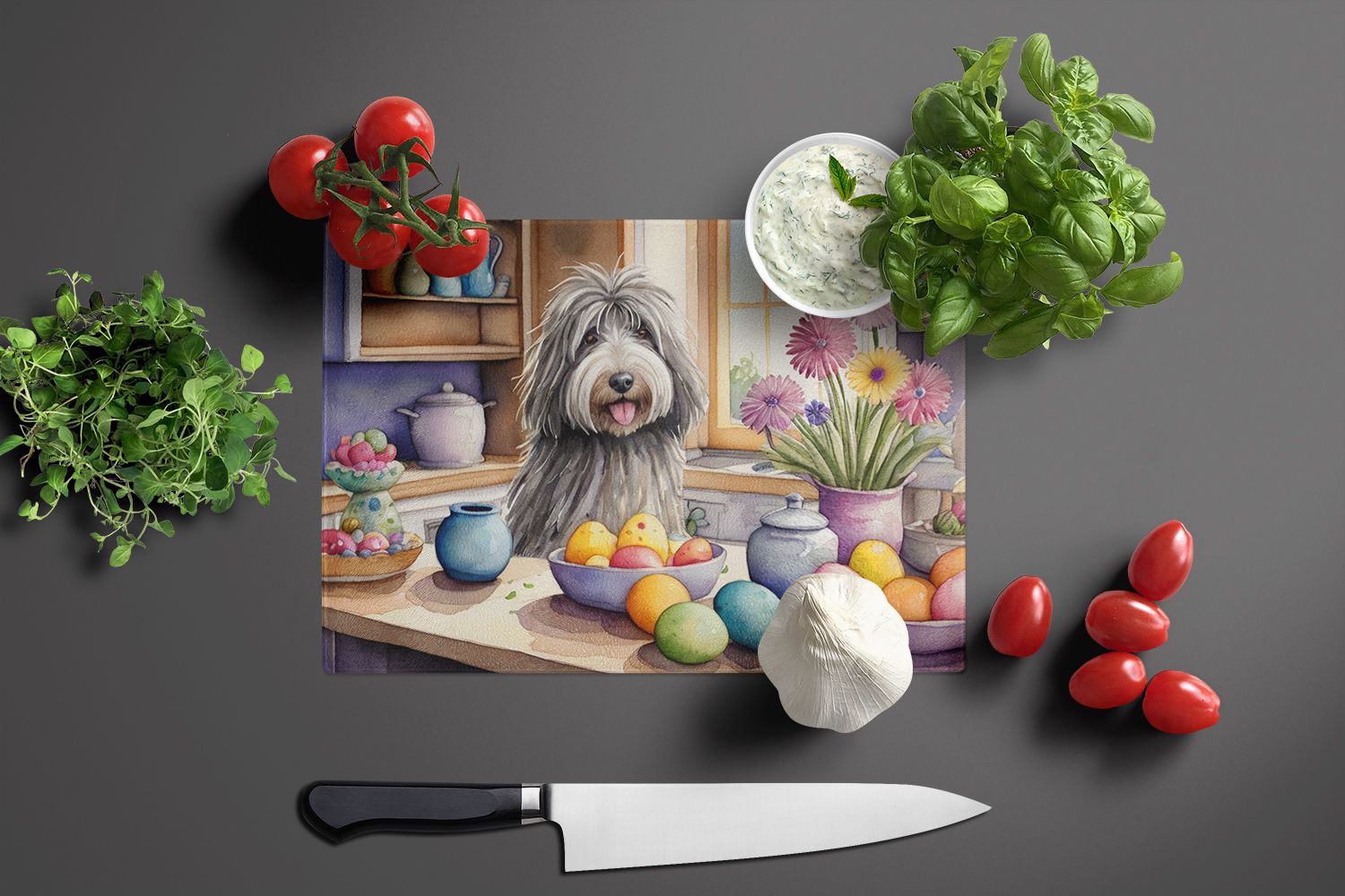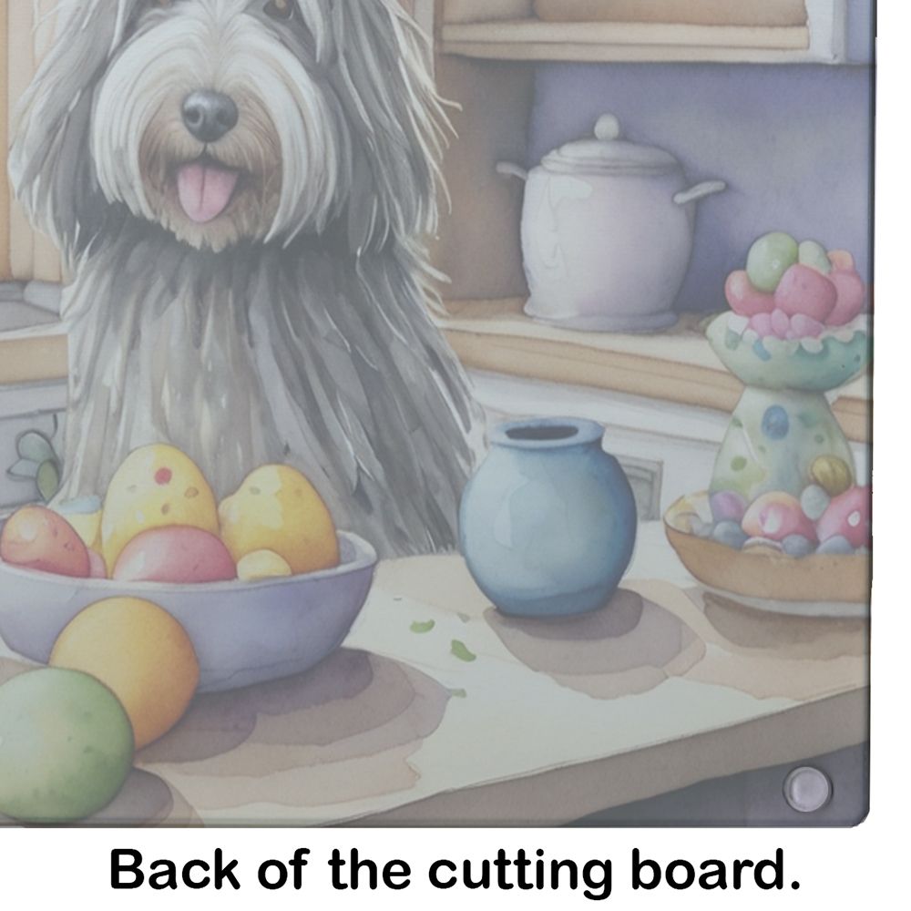 Glass Cutting Board featuring breed specific Bergamasco Sheepdog artwork. Celebrate Easter with this Easter Cutting Board. Introduce your kitchen to the vibrant, large Decorative Glass Cutting Board from Caroline's Treasures. Crafted from resilient tempered glass, this board is not only a utilitarian necessity but also a colorful art piece. With its generous dimensions of 15 inches in height and 12 inches in length, it offers ample space for all your cutting needs. Every piece showcases captivating artwork from distinguished artists, bringing an aesthetic edge to your kitchen. Beyond its attractive design, this cutting board ensures your countertop stays pristine and unscathed, owing to its heat-resistant properties. Engineered with user convenience in mind, it features non-skid feet for stability, and rounded corners for additional safety. Its robust construction renders it virtually unbreakable, guaranteeing longevity. The board comes with protective feet bumpers, maintaining its position during use. This product is recommended to be hand washed only. Proudly printed and assembled in the United States, this cutting board exemplifies superior craftsmanship. With Caroline's Treasures' Decorative Glass Cutting Board, you're investing in a blend of functionality and artistic flair.