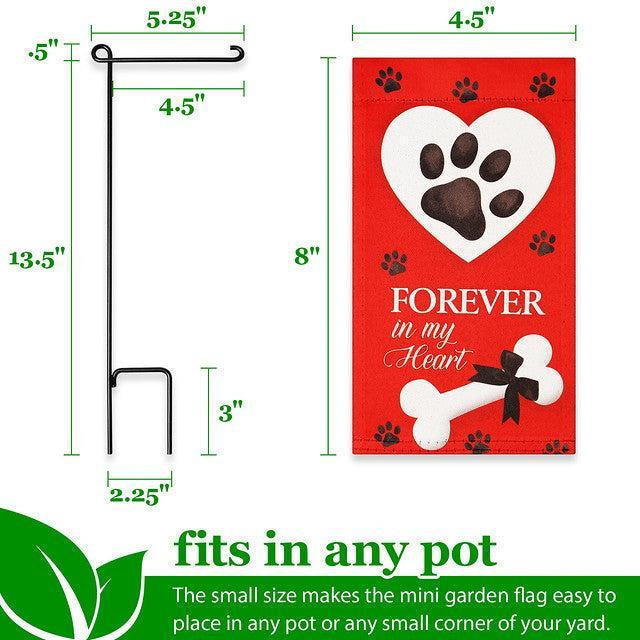 1.DURABLE POLYESTER MATERIAL AND GARDEN STAND - This garden flag is made of durable blockout material GARDEN FLAG SIZE - The flag size is 4 x 8 inch (10 x 20 cm). GARDEN FLAG STAND - The stand is 6 x 14 inch (15 x 36 cm) WIDE APPLICATION - This garden flag is suitable for any deck, patio, porch, veranda, backyard, lawn or garden, adding a pleasant and lively atmosphere anywhere you go