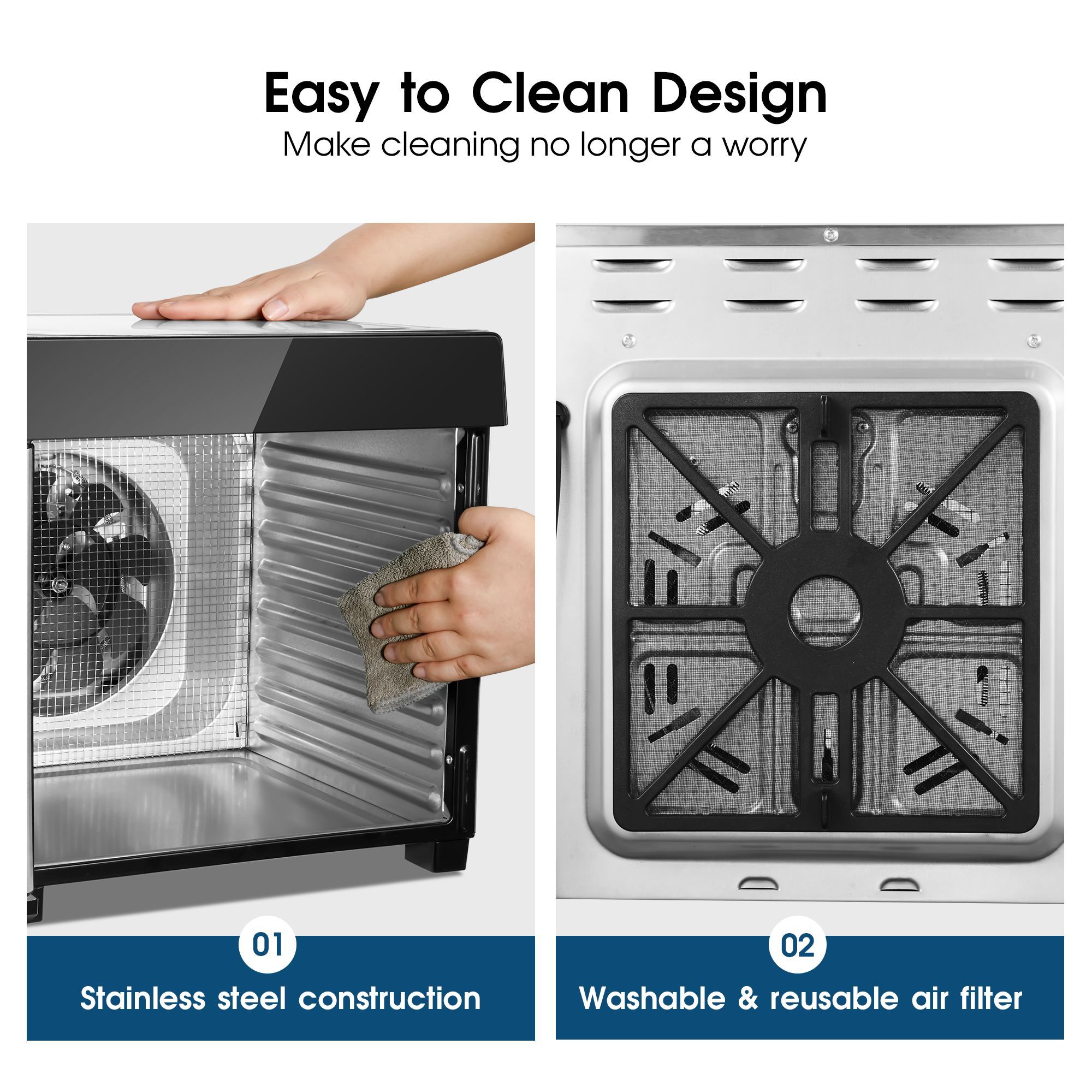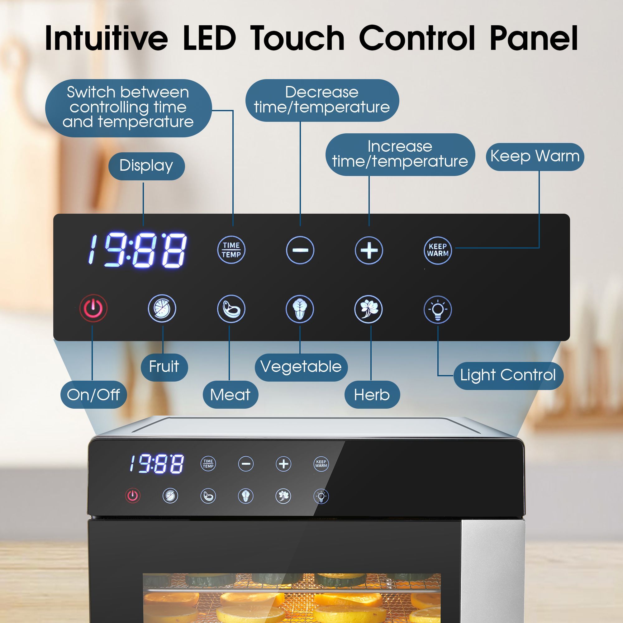 [Precise Temp & Timer Control]The fruit dehydrator build-in precise LED digital control panel, digital temperatures settings range from 95º F to 165º F (accuracy down to 1 degree), with a countdown timer up to 48 hours, provides accurate drying times and temperatures to make it super easy for you to start creating delicious dried fruit, jerky, herbs, meat or yogurt!