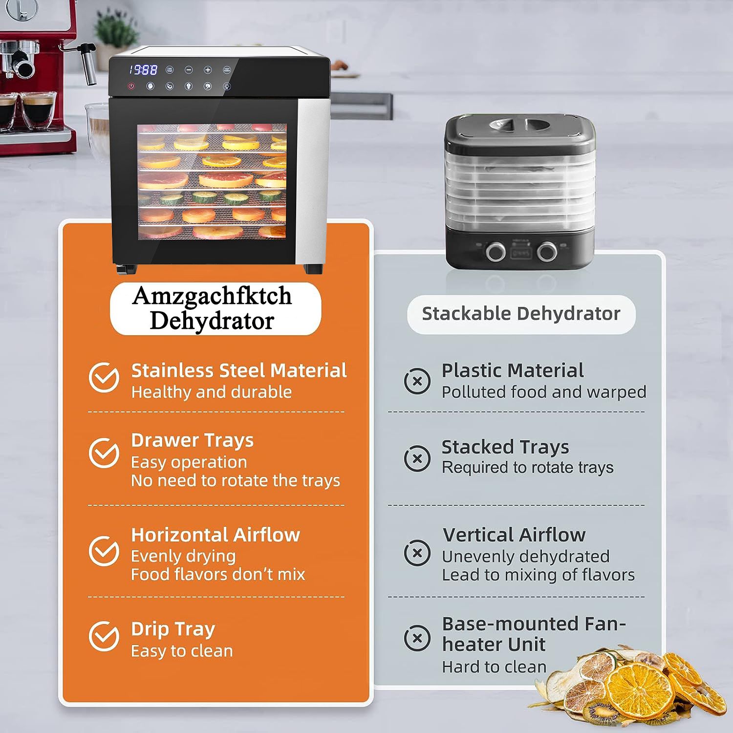 [What You Get]Package includes 1 x stainless steel food dehydrator machine, 8 x stainless steel trays, 2 x mesh screen, 1 x fruit roll sheet, 1 x user manual, and 1 x online recipe. Amzgachfktch offers a 12-month warranty and lifetime support. If you encounter any problems, please feel free to contact us. Start making your healthy snacks with this dehydrater!