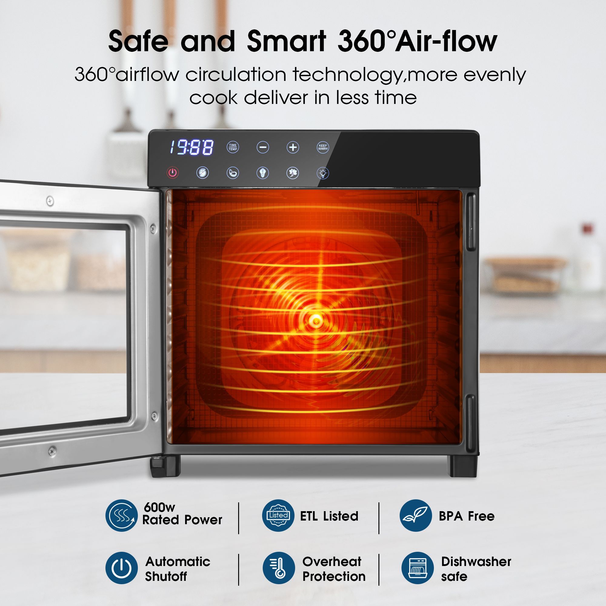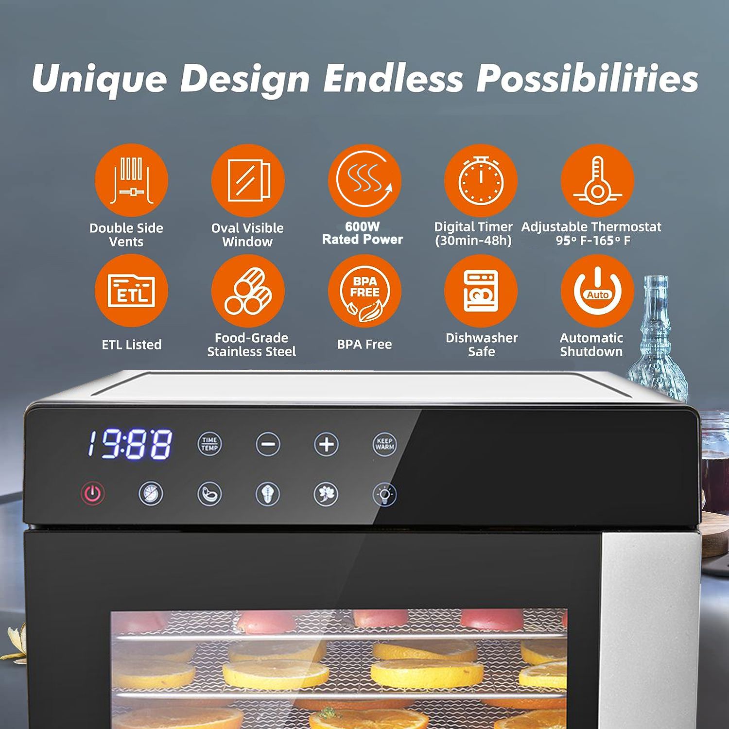 [Innovated & Unique Design]The newly designed food dehydrator is equipped with 4 customizable preset menus, just one-touch for fruit, meat, vegetable and herb. Keep warm function to keep the food warm and fresh. Cook delicious and healthy treats in less time with a 600W rated power, a rear-mounted drying fan and 360°air flow circulation technology to promote even drying. Monitor the dryer process easily with the transparent door window.