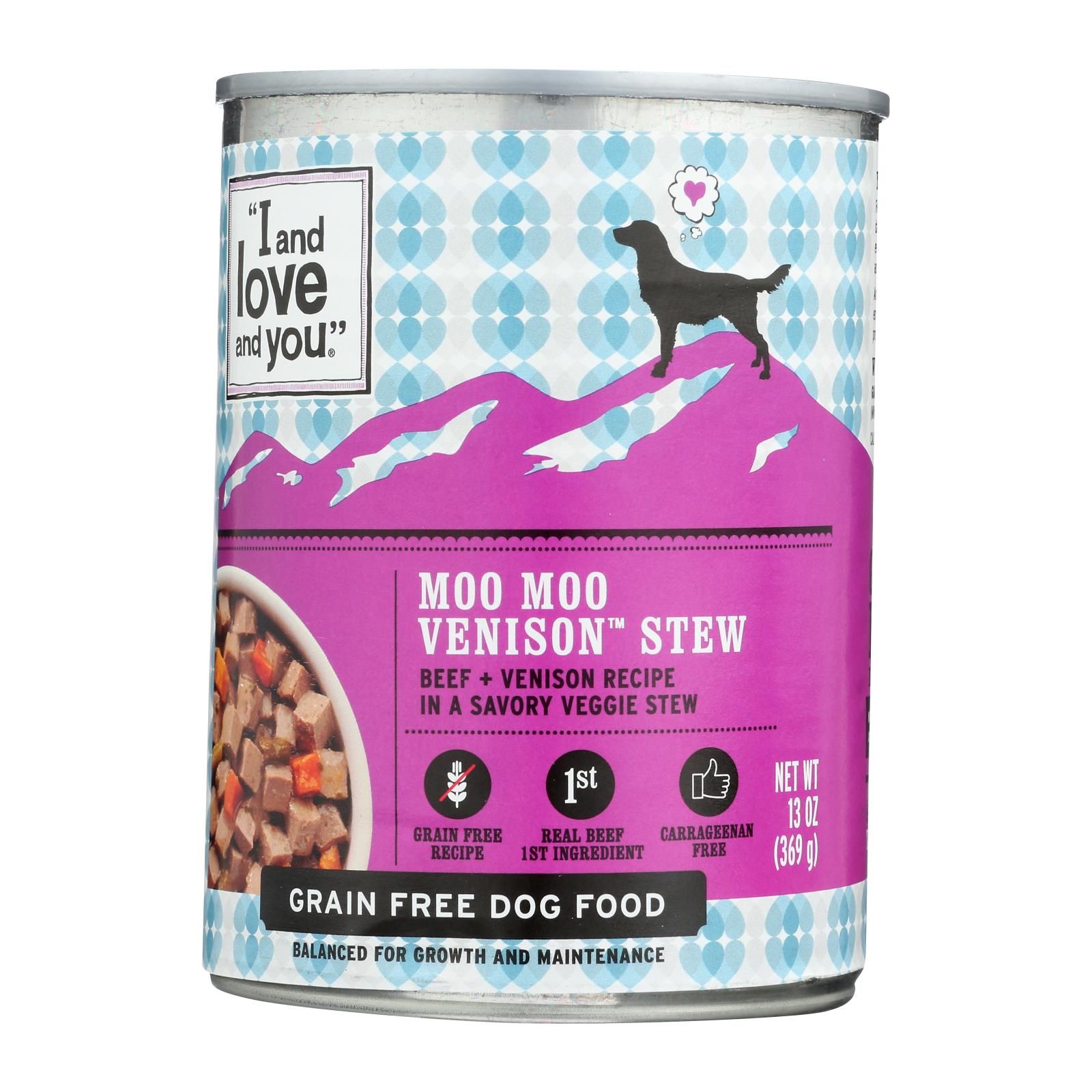 I and love and you dog canned food, moo moo venison stew is a grain-free, balanced formula for growth and maintenance. Made with beef and venison morsels in a savory veggie stew, this dog food is free from artificial colors, flavors and preservatives. Each can of i and love and you dog canned food, moo moo venison stew contains 13 oz. Of product.