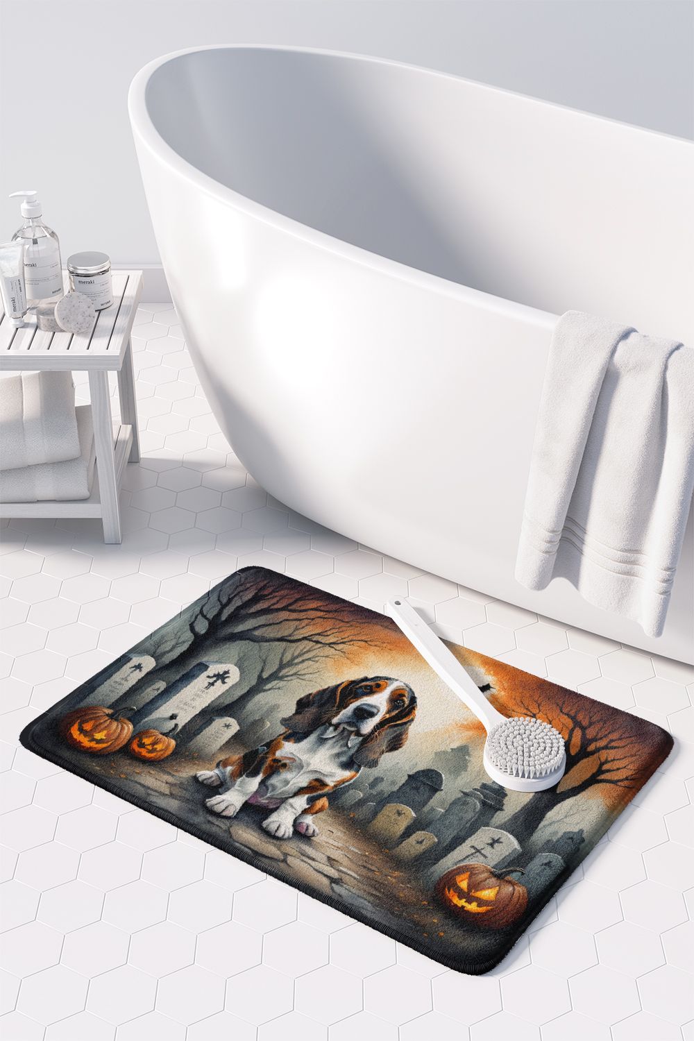 Memory Foam Kitchen Mat featuring breed specific Basset Hound artwork. Celebrate Halloween with this Halloween Floor Mat. Transform your floor into a work of art with Caroline's Treasures' Memory Foam Mat. This mat offers not only a stunning visual appeal but also a luxurious, plush feel that's incredibly comfortable to the touch. It's a versatile, machine-washable mat designed for both bath and kitchen use, ensuring you experience the best in comfort and convenience. Care Instructions: Maintaining this memory foam mat is a breeze. Simply follow the care instructions on the product tag. It's recommended to wash in cold water and dry on a low-temperature setting in the dryer. This ensures the mat retains its quality and longevity, allowing you to enjoy its beauty and comfort for a long time. Caroline's Treasures' Memory Foam Mat Machine Washable is the perfect blend of artistry, comfort, and practicality, making it a standout addition to any space. Upgrade your home decor with this versatile and stylish mat today.