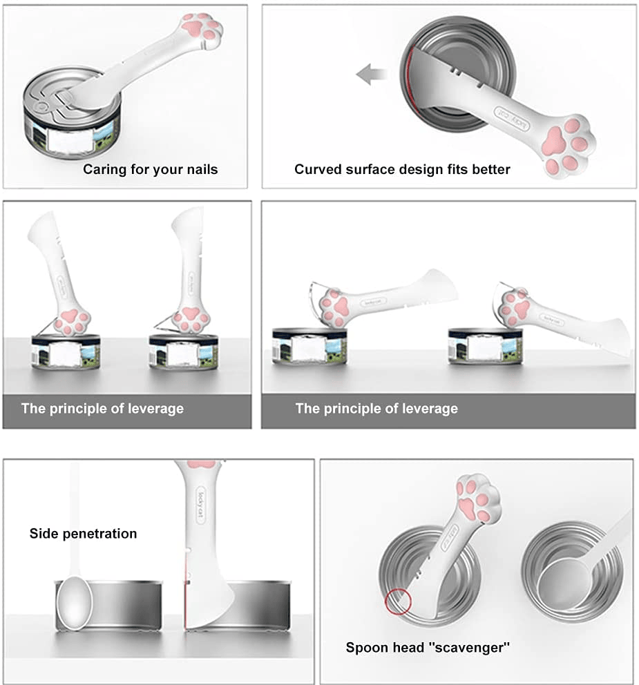 Multi-functional pet can spoon: the pet can spoon is not only a simple spoon; it is also a good can opener for you to open the pet can without hurting your nails when opening the can lip; It is designed with a straight side; a curve side and a pointed-angled tip; which can enter the bottom and corners of the can and scoop out every bit of food easily