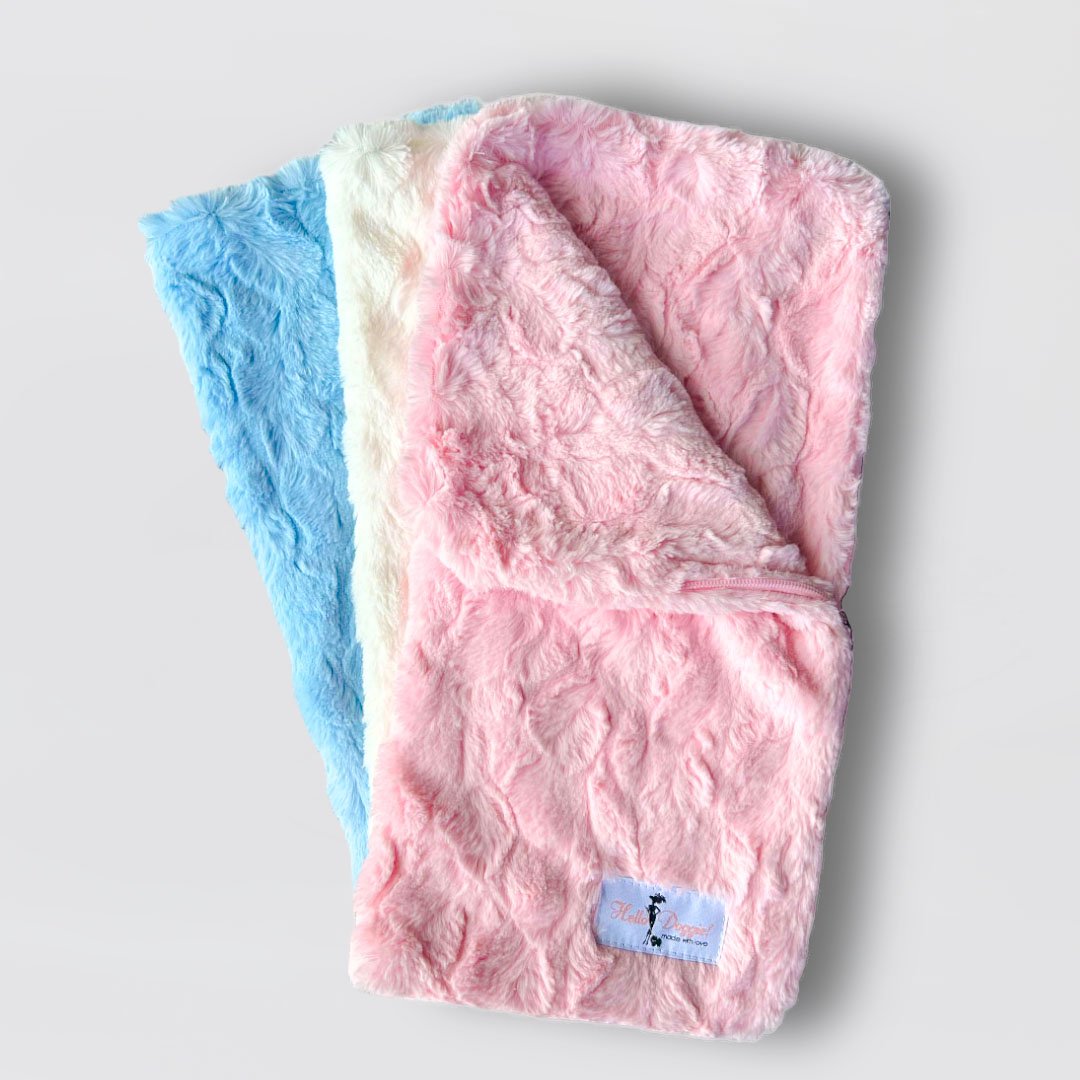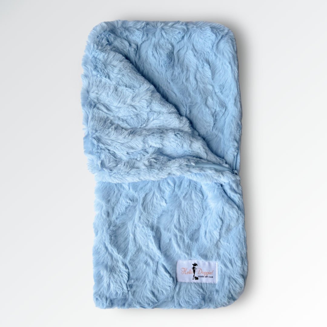 It’s a snuggie for your puppy! Enjoy these Snuggle Pup sleeping bags handmade by Hello Doggie. It has the ability to be unzipped and be used as a blanket or to swaddle your baby after a bath. A great way for new moms to take their babies home. Made with the most luxurious Bella fabric, they keep your baby warm and dainty all at once. Machine washable, delicate was in warm water. Delicate dry.  Zipped Up - 17 1/2" x 9"   |   Unzipped  - 18" x 17"   |   Holds dogs up to 4 Lbs MSRP - $49.99 *Snuggle pup is handmade and sizes may vary slightly. Made in USA.