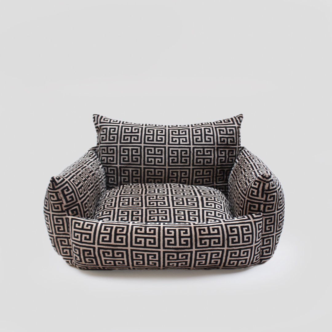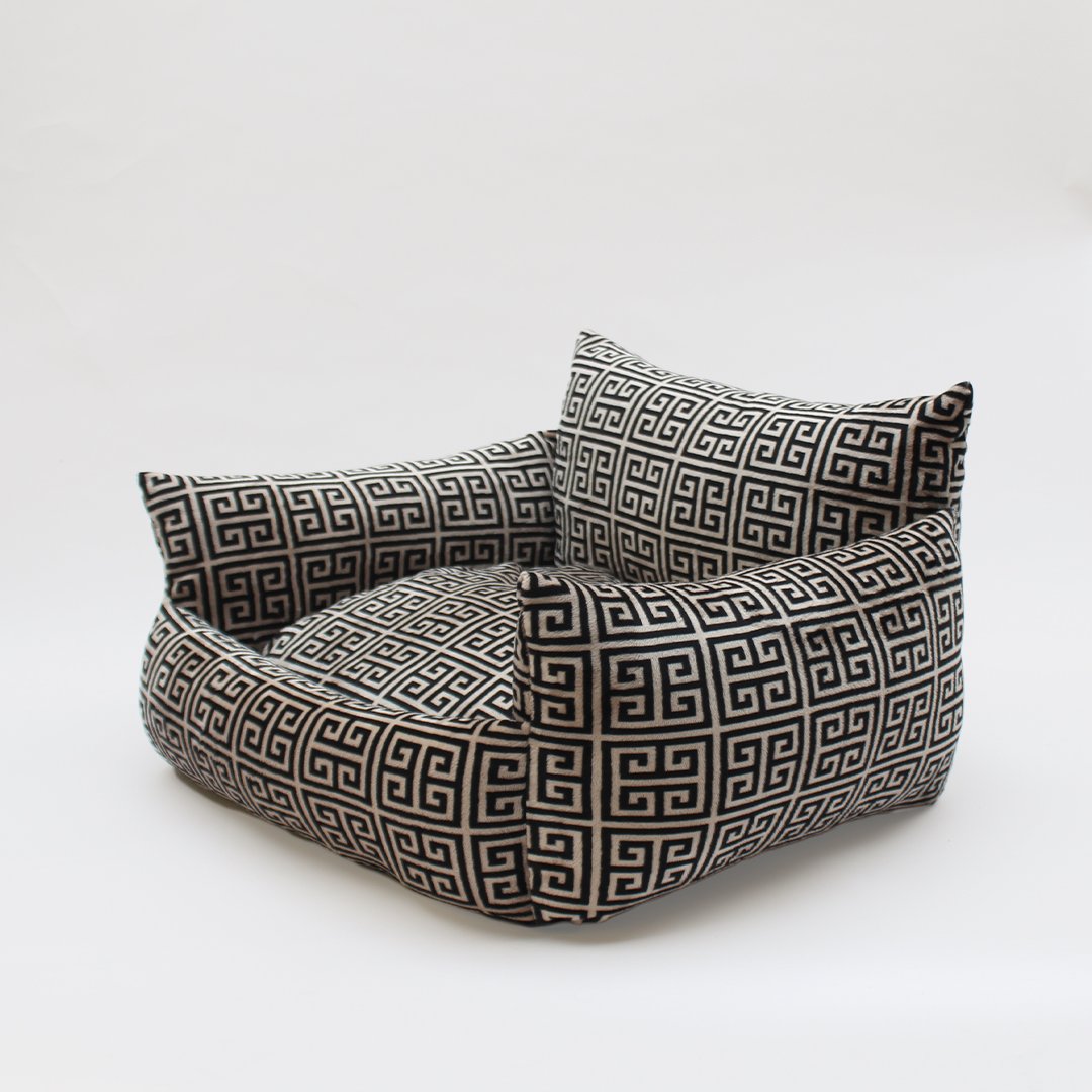 "The Obsidian Dog Sofa by Hello Doggie is silky soft to the touch you'll want to lay in them too! These handmade beds are made from the highest quality of fabric and stuffed to perfection with 100% poly-fiber fill for longer-lasting fullness and durability. The Obsidian Dog Sofa features a removable pillow for easy care and a non-slip floor to hold the bed in place will make your pup feel like the Greek god or goddess that they truly are. Wash on a gentle cycle, with no bleach or softener. Air dry or tumble on low. Dimensions Outside - 25” x 20” x 15” Inside - 16” x 15” x 7” (Bolster) Pillow – 19” x 16” x 4”      |      For dogs up to 20lbs MSRP- $196.00 *Sofas are handmade, sizes may vary slightly. Made in USA."
