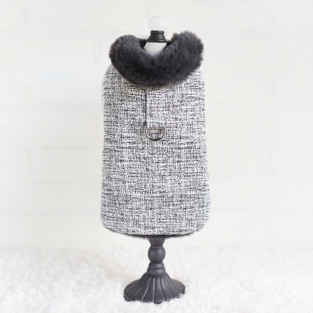 Your precious pooch will look regal in the Zha  Zha (Ja-Ja) Dog Coat by Hello Doggie. Our new coat collection was released just in time for the fall/winter season. When designing this coat we had the pooch in mind, our fur babies get cold too while they're out on the town for holiday shopping or a walk in the park. The coats are made from a beautiful soft tweed blend fabric and are lined with faux fur for a timeless design  and to keep out that extra chill. These coats are perfect to pair up with your favorite Hello Doggie sweater, featuring adjustable velcro straps for a perfect fit when adding layers. It is easy to care for, delicate wash with no softener or bleach and air dry. Our coats are fashionable and most importantly comfortable to wear. Each Coat has a matching harness, sold separately. Limited Edition MSRP $84.00 * Coats are handmade sizes may vary slightly. Made in the USA.
