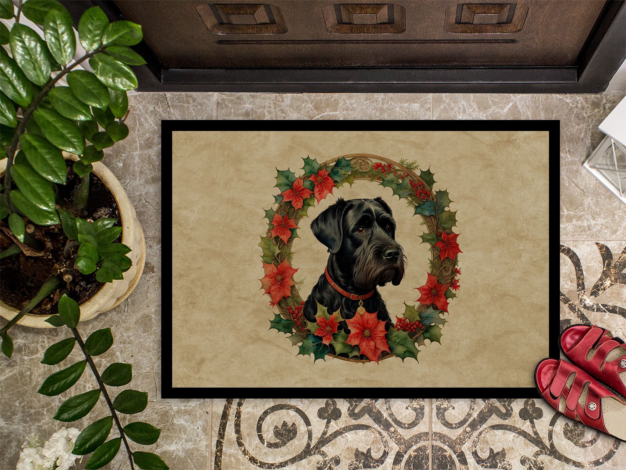 Doormat featuring breed specific Giant Schnauzer artwork. Celebrate Christmas with this Christmas Doormat. Welcome your guests in style with our Artwork Door Mat, designed to withstand almost any weather condition. This mat, measuring approximately 24 by 36 inches, is held together by durable black binding tape. Its top layer, composed of polyester felt, is dyed with the eye-catching image you see on the mat. A few layers below provide the mat with stability, while its rubber bottom is stamped to help prevent slipping and ensures safety. Our mat works wonderfully as both an indoor or outdoor door mat. For cleaning, simply hose it off with water or use a power washer - no need for any cleaner that produces suds. Avoid scrubbing with a brush, instead, opt for the vacuum on floor setting. Designed manufactured and printed in the USA, this mat is a perfect addition to your porch, outdoor kitchen, entryway, or any indoor space. Its unique design makes it a charming decorative rug that greets your guests and adds a stylish touch to your home decor.