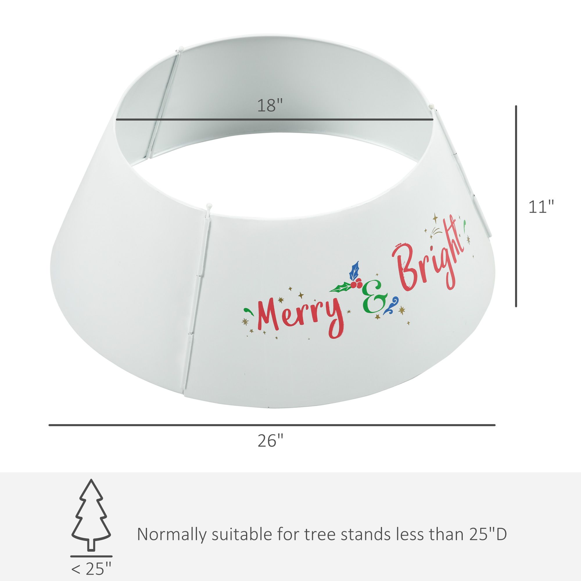 5.- Collar for Christmas Tree Information: Overall Dimension: Φ26" x 11" H, Top Diameter: Φ18". Normally suitable for 7.5ft high Christmas trees or tree stands less than 25"D. Note: We suggest that you measure your tree stand to ensure its fit within the collar.