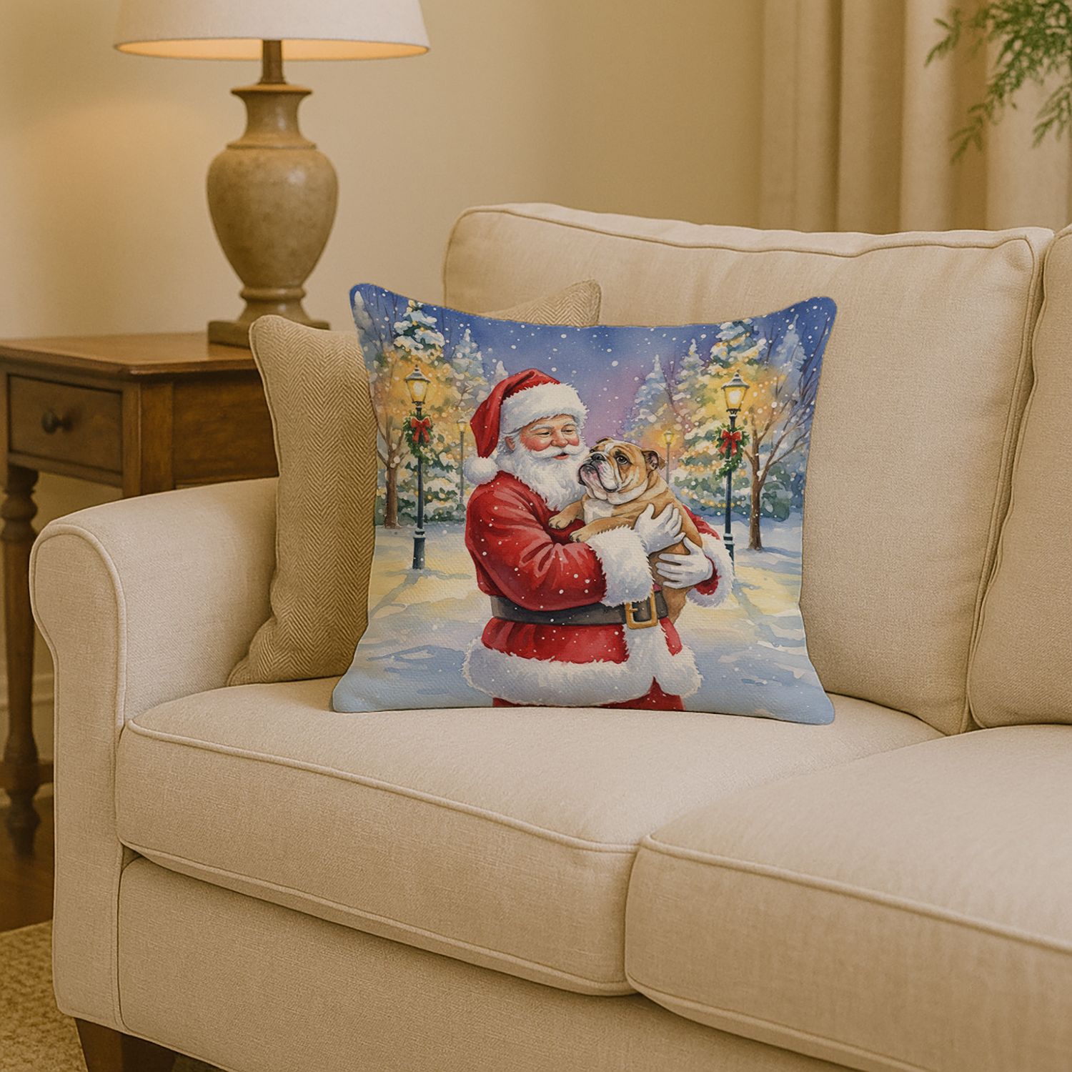 Throw Pillow featuring breed specific English Bulldog artwork. Celebrate Christmas with this Christmas Pillow. Add a touch of vibrancy and comfort to your outdoor seating with Caroline's Treasures Fabric Decorative Pillow. Measuring approximately 14 inches by 14 inches, this outdoor pillow is crafted to elevate the appeal of your patio furniture, infusing it with vivid color and artistic flair. The pillow includes a 100% Polyester Fabric sham filled with a quality pillow form to provide superior comfort. Innovatively made from our brand new material, specifically woven for its water resistance, this pillow is designed for durability. The soft canvas fabric offers versatility in use, fit for your indoor couch or your outdoor patio, porch, or veranda. The fabric is dyed with colorfast dyes built for resilience against weather conditions, ensuring the pillow retains its beauty over time. Constructed by sewing three fabric pieces to create a sham, the polyester insert is then nestled inside to form the pillow, resulting in an overstuffed pillow that maintains its shape. Both the sham and the pillow insert are proudly made in the United States. As the pillows are handcrafted, there may be minor variations in size, further enhancing their unique charm. Experience comfort in style with Caroline's Treasures Fabric Decorative Pillow.