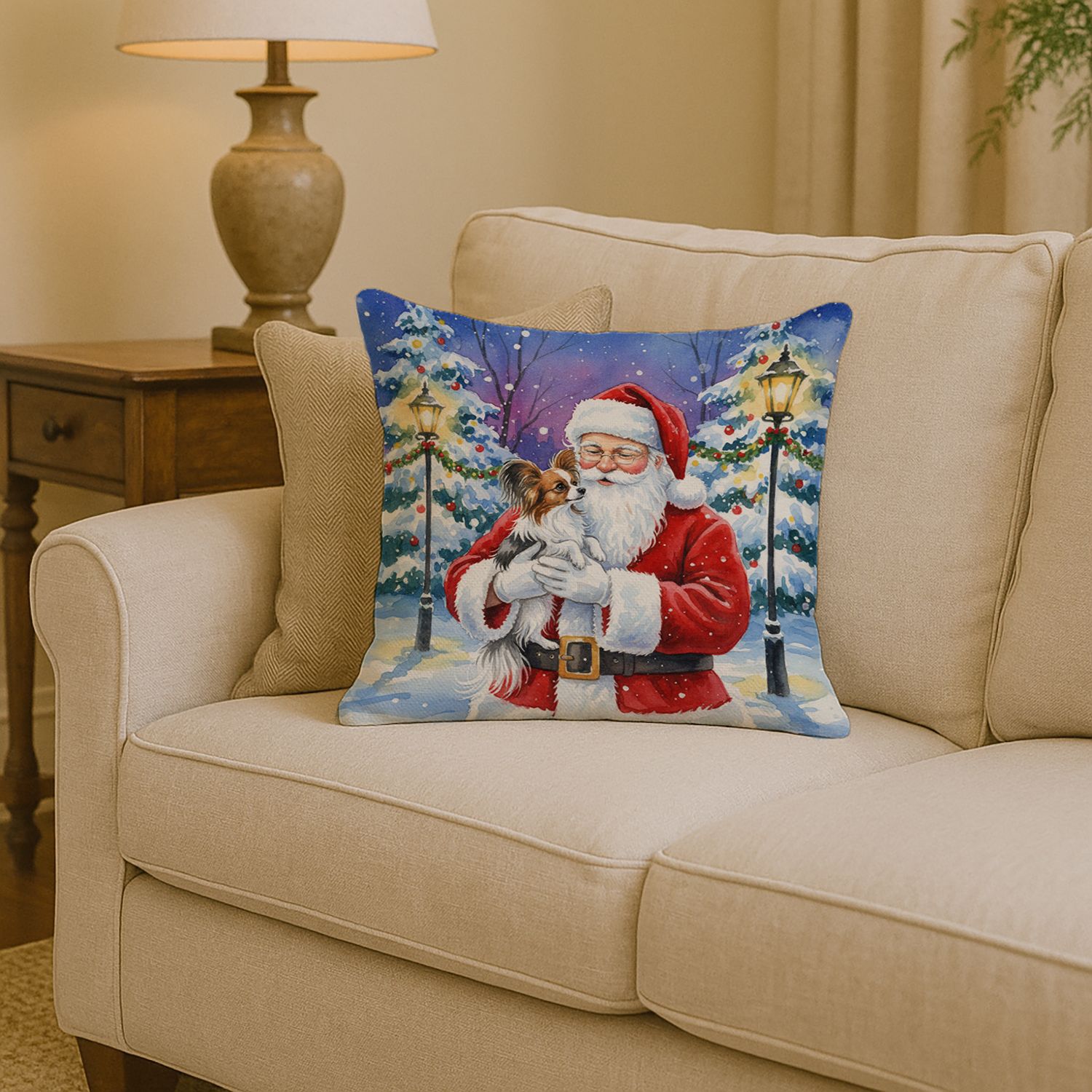 Throw Pillow featuring breed specific Papillon artwork. Celebrate Christmas with this Christmas Pillow. Add a touch of vibrancy and comfort to your outdoor seating with Caroline's Treasures Fabric Decorative Pillow. Measuring approximately 14 inches by 14 inches, this outdoor pillow is crafted to elevate the appeal of your patio furniture, infusing it with vivid color and artistic flair. The pillow includes a 100% Polyester Fabric sham filled with a quality pillow form to provide superior comfort. Innovatively made from our brand new material, specifically woven for its water resistance, this pillow is designed for durability. The soft canvas fabric offers versatility in use, fit for your indoor couch or your outdoor patio, porch, or veranda. The fabric is dyed with colorfast dyes built for resilience against weather conditions, ensuring the pillow retains its beauty over time. Constructed by sewing three fabric pieces to create a sham, the polyester insert is then nestled inside to form the pillow, resulting in an overstuffed pillow that maintains its shape. Both the sham and the pillow insert are proudly made in the United States. As the pillows are handcrafted, there may be minor variations in size, further enhancing their unique charm. Experience comfort in style with Caroline's Treasures Fabric Decorative Pillow.