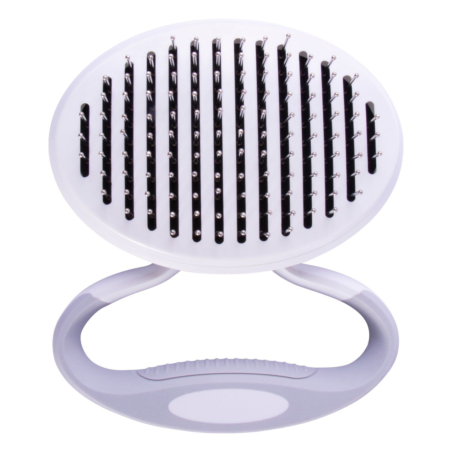 The Pet Life ® 'Gyrater' Travel Self-Cleaning Swivel Pet Pin Brush features a Built-in customizable rotating handle hinge that both swivels and locks into place at the press of a button to your desired handle setting. This Brush offers both a Palm and Knuckle Handle grip options and features a contoured inner grip with a Rubber-like TPR material for added grip and comfort while brushing. Designed to place less Stress on the hands and wrists during usage. Features an ejectable button located on the reverse that neatly ejects shedded hair follicles that make disposal of hair convenient. The Pins are the perfect length for both Dog and Cat Short Hair and Long Hair Breeds. Small and Compact make it perfect for Travel.