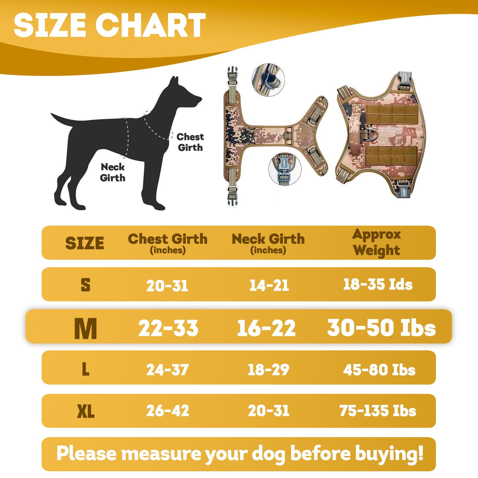 1.Desert Camo Dog Harness Medium is the perfect tool to help you walk, hike or travel with your pet! The highly visible dog tactical vest has an optimal weight and is suitable for every dog weighing 30-50 pounds, neck girth 16-22 inches, chest girth 22-33 inches. Please measure your dog before buying.
